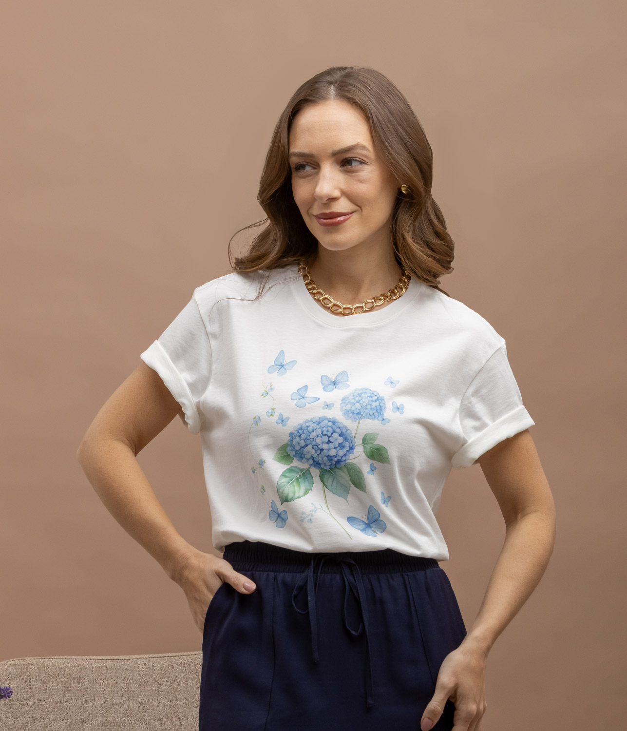 T-shirt 100% algodão nacional 30.1 penteado, com estamparia digital em lindas flores hortências. Costura reforçada e acabamento de altíssima qualidade. Uma peça lindíssima para fazer muitas combinações.